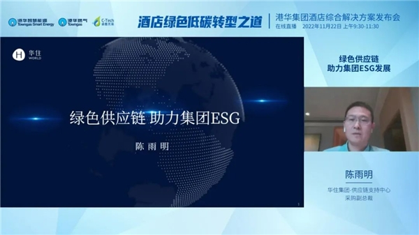 华住集团供应链支持中心采购副总裁陈雨明进行《绿色供应链,助力集团ESG》主题分享。他表示,华住集团拥有超8000家酒店,供应链包含酒店设计、施工、采购、成本、创新等全生命周期服务。“通过华住供应链易购平台全面数字化升级及ESG理念的全面推行,大大提升了集团供应链之间的协同能力和管理效率,有效支撑集团战略。”同时在易购平台数字化应用领域,他重点分享了酒店布草洗涤集中化创新经验,“通过洗涤厂商的培优计划,优选如卓惠洗涤等绿色低碳洗涤厂商进行认证与合作,共同构建智慧布草洗涤模式,实现洗涤厂商集中化、线上化管理,达到降本增效、提质降碳。”