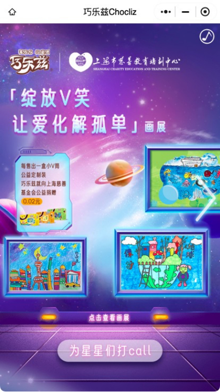 同时,巧乐兹也开展了主题为“绽放V笑 让爱化解孤单”的线上H5公益画展,不仅让更多的人看到来自“星星”的美好与感动,也让更多的消费者成为公益行动的参与者、传播者,延续温暖与大爱。而这些打动人心的瞬间,可以很好的反哺品牌,持续为品牌创造沟通触点、沉淀品牌价值。