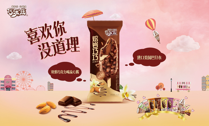 此外,巧乐兹也持续不断的在产品结构上进行创新突破。2022年巧乐兹上市新品熔岩巧巧,外层脆皮选用了大颗粒的美国进口巴旦木,而冰淇淋内料中,却创新的灌注了双股流心酱,以巧克力味脆皮+冰淇淋奶料+流心酱的三重丰富结构,带给消费者更加独特的食用体验。