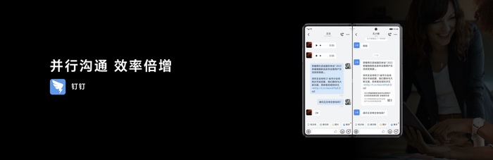 面向未来沉浸式大屏时代,钉钉也在Pad、折叠屏和XR设备上做了大量的探索和落地,将产品与设备新特性相结合。比如,钉钉在主流的Pad和折叠屏手机中可以支持应用的左右分屏,用户可以一边聊天,另一边看文档,或者开视频会议,实现多任务的并行处理。