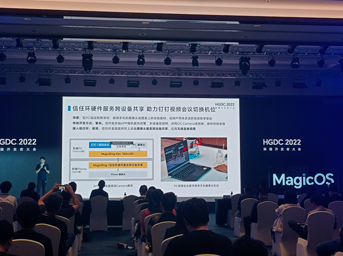 日前,荣耀在首届开发者大会(HGDC 2022)上,发布新技术 MagicRing 信任环,实现应用服务在跨设备间的流转和共享。钉钉作为合作伙伴代表,在主题演讲中分享了基于荣耀MagicOS系统开放能力和MagicRing信任环技术的合作成果,钉钉文档、日历、视频会议等产品率先落地相关技术,打造可靠流畅、便捷高效的终端跨设备协同体验。会上,钉钉与荣耀还宣布将成立联合实验室,聚焦高可用、流畅体验和更多协同办公场景持续探索,共建开放共赢的生态产业链。