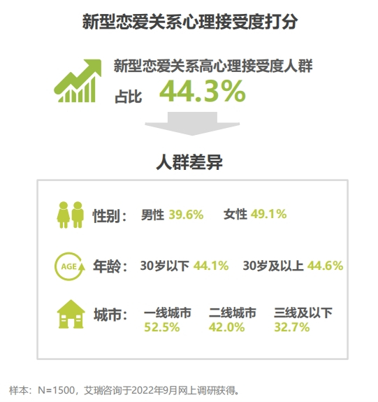 据统计,有44.3%的人对新型恋爱关系表现出较高的心理接受度,其中女性赞同比例达到49.1%,高于男性的39.6%。另外,一线城市人群的认同比例明显高于二三线城市,达到了52.5%。