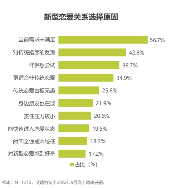 新型恋爱关系的出现,是外部环境刺激和个人意识转变的共同结果。从外部因素分析,身边人不幸的情感经历和媒体关于单身自由的宣传,降低了人们对情感的信赖度和依赖度;西方的开放思想和文化引入国内,催生新的恋爱形式;且社会上异性资源丰富,结识成本较低。