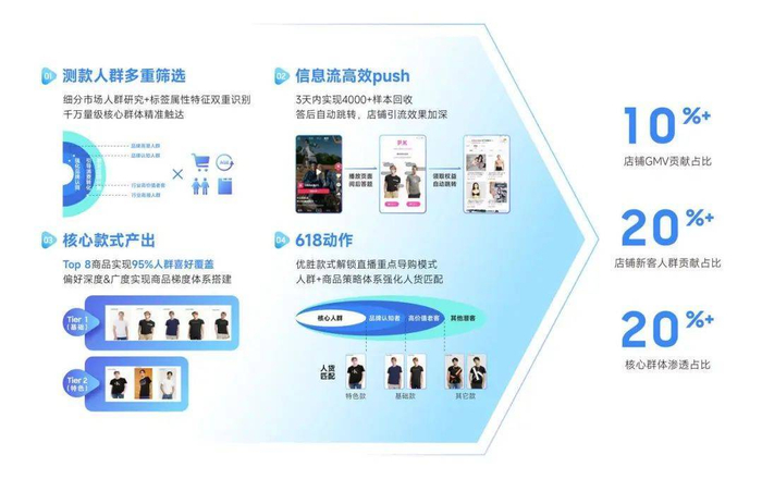 基于测款核心结论优选出的8款潜力爆品,有效覆盖95%的目标人群需求,再配合大促期间品牌自有直播间针对测款上架商品加强导购力度模式,品牌实现目标客群拉新与单品GMV动销达成。