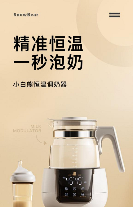 据了解,当前很多妈妈处在“左手抱娃,右手调奶”的状态,很难腾出双手或时间来真正意义上陪伴宝宝。尤其对于小月龄以及刚生完宝宝的宝妈来说,一方面宝宝吃奶需求可达上千次,而刚生完宝宝的宝妈身体又比较虚弱,对于来回折腾宝宝调奶这件事无疑让宝妈很难安心的休息。对于市场上不同阶段差异化奶粉温度需求以及日常生活所需,单一的烧水壶显然又很难满足母婴日常需求。能够随时调奶、可以精准控温恒温、满足家人用水需求以及多场景使用特点,则更符合现在母婴家庭对育儿观念的转变和升级,小白熊很敏锐地觉察到了这一点。