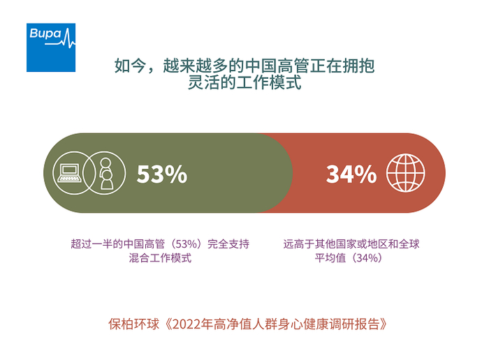 事实上,受疫情影响,越来越多的高净值人士乐意接受灵活的工作模式。对于希望平衡工作与生活的人来说,混合工作制被视为一种可接受的折衷方案。在中国尤其如此,超过一半的中国高管(53%)完全支持混合工作模式,远高于其他国家或地区和全球平均值(34%)。
