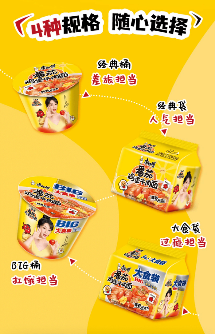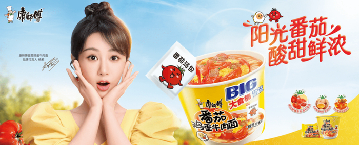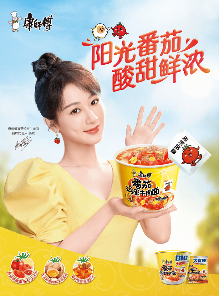 近日,“康师傅番茄鸡蛋牛肉面”(以下简称:‘番茄鸡蛋牛肉面’)迎来原料、工艺、包装等维度的全新升级,并推出了4种规格的产品(经典桶、经典袋、BIG桶、大食袋),供消费者根据食用场景随心选择。同时,康师傅还正式签约国民实力派小花杨紫为代言人,通过杨紫个人年轻、阳光、活力的形象与产品进行捆绑,进一步强化消费者对产品#阳光番茄 酸甜鲜浓#的印记。