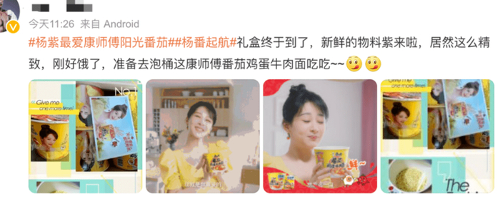 据了解,伴随着“杨番起航”的官宣,热搜话题#杨紫最爱康师傅番茄鸡蛋牛肉面#官宣代言人在微博上引爆,并引发大量次级传播。同时,#阳光番茄 酸甜鲜浓#话题在微博、CCTV、OTV/OTT大硬广、线下地广等媒介以康师傅番茄鸡蛋面和杨紫的组合形象共同出现,更是引发了粉丝群体及方便面爱好者的广泛关注和讨论。