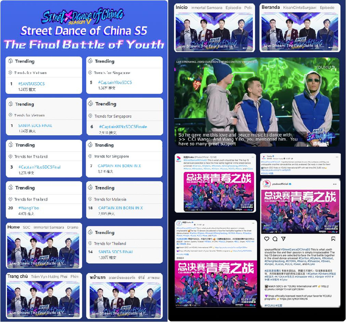 不仅是舞台上的名场面让观众和粉丝目不暇接,舞台外的热度更是一飞冲天。截至收稿,节目累计斩获全网热搜数量2787个,其中决赛夜即斩获全网热搜362+,席卷微博、抖音、快手、知乎等各大平台,登顶猫眼全网热度、灯塔播放市占率、骨朵热度指数、Vlinkage综艺播放指数等多榜单TOP1。运动不分国界,《街舞5》化身各国街舞爱好者的连接纽带,决赛期间,节目相关话题登上越南、泰国、新加坡、马来西亚等多国推特趋势,最高达到Top1。