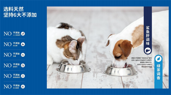 除了严苛标准之外,小青鲨还从源头上把关,在工艺中求精、配方上下功夫,坚持六不添加等保障宠粮品质。