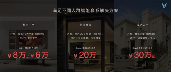云米更为不同类型的家庭设置了智能套系解决方案,让智能生活落户万千中国家庭。针对成功人士,云米推出了更为奢华的Royal套系,囊括125件智能产品,适用于8房3厅的亿元级别墅,突破了国内全屋智能家居市场的“天花板”,充分体现了云米抢占高端市场的决心与信心。对于行业精英,云米搭配了Space套系,囊括86件智能产品,适用于5房2厅的千万级豪宅,总价20万;而对于都市中产人群,云米推出了Super套系,囊括56件智能产品,适用于3房2厅的百万级洋房,总价6-8万,充分满足不同家庭的个性化需求。