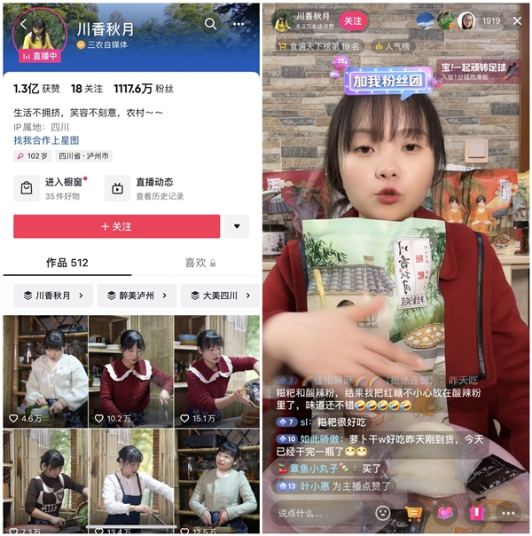 在产业融合方面,抖音电商除加大平台宣传力度为乡村特色产业助力外,还积极促进农业与文化、旅游业的融合,并帮助乡村地区打造特色产业集群,提高乡村农业在市场中的竞争力。在抖音@川香秋月 直播间,主播以特色农产品加工的方式为家乡萝卜干带货,不仅让濒临倒闭的工厂红火起来,还带动了两百多名村民就业。未来,@川香秋月 还计划搭建更广阔的产业体系,带动更多农村地区老乡致富。