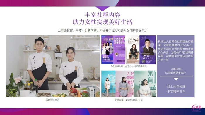所以我们的每一位护肤达人,不仅仅是提供专业的肌肤咨询服务,也会提供陪伴成长的家庭指导服务,如闺蜜挚友般随时守护在客户身边。在日常生活中,护肤达人会及时了解客户近期的生活动态,及时解答客户的疑难问题,从个人成长、家庭关系、形象改变等方面,帮助她们实现自我提升。在帮她们树立自信的同时,也提供丰富多彩的社群课程,涵盖护肤、化妆、穿搭、形体、养生、情感等知识分享,带领万千女性一起由内到外精致变美。