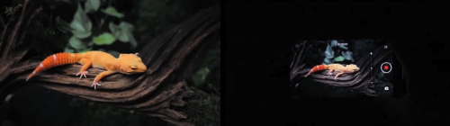 通过这段视频截图中我们可以看到,在几乎全黑的夜色中,vivo X90不仅将橙黄色的守宫展现得明艳、流畅,就连背景中的绿色叶片也呈现出自然的色彩和景深状态,这就是vivo X90系列基于自研芯片V2的特色功能:4K超感“夜视仪”。