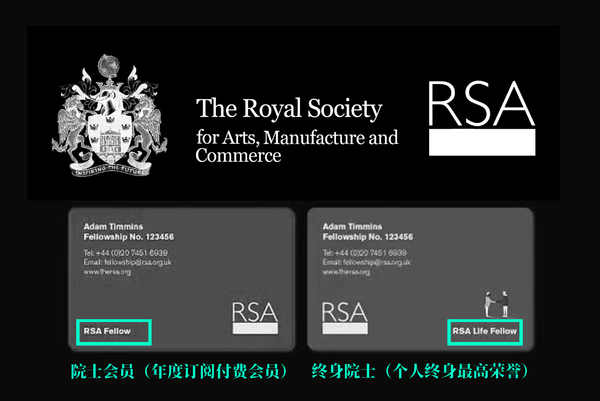 皇家学会身份ID卡标注:RSA Fellow ,一般是由企业家、设计师、建筑师、创业精英、大学讲师以及优秀的青年大学生构成,通过推荐审核的形式成为该机构院士平台订阅会员并每年以慈善捐款的形式进行会员费用支付。可以参与该机构的各项会议活动同时可与该机构其它会员进行通讯往来,该付费会员订阅有效期为一年,逾期未付费将关闭会员订阅,订阅院士会员的资格将会被临时保留一定的时间,如长期未缴纳会费最终该机构将实行注销,目前该机构付费订阅的院士平台会员约有3万多名遍布全球各个国家及地区,获得该院士平台订阅会员资格同是全球化行业精英的重要标记以及资源网络的关键平台,由于部分传播未做精准区分导致该机构的订阅会员与终身院士产生了身份混同的误解,请受众见上文详解。