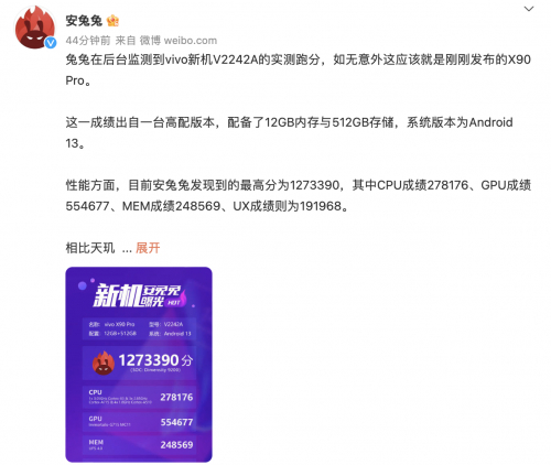 vivo X90系列已经发布,但关注热度依旧高涨。就在今天,安兔兔录入了X90 pro机型跑分,成绩超127万,接近vivo发布会中公布的实验室跑分128万,引发热议。
