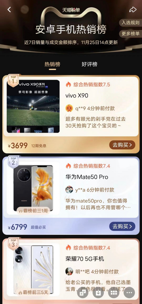 目前,已开启预售的vivo X90 凭借出色表现和过硬口碑,一路冲上天猫安卓手机热销榜首位。