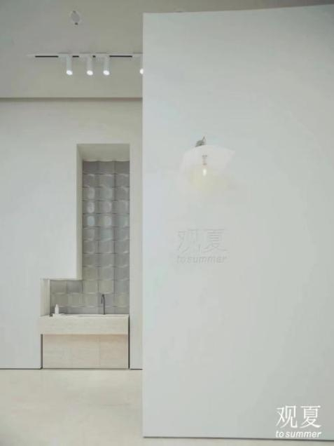 着迷于烟雨朦胧的江南民居,层层叠叠的屋顶呈现出水墨画里常见的黛色。观夏空间紧邻的西溪湿地,常年水汽升腾,草甸、湖面与天相连接,亦呈现出一种令人神往的水墨黛色。因此,观夏联合了景德镇手工艺人共创了空间内的整面黛色瓷墙。这面瓷墙整体形状呈波浪形散开,看着它就像是看到了水墨般的江南景致。沿着入口区的净手台进入到空间内部,移步换景,形成了流动的视觉感受。