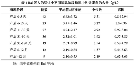 根据文献整理统计,以不同哺乳阶段进行分组,所得出平均乳铁蛋白含量如表1所示:产后母乳中的乳铁含量会在产后越来越少。