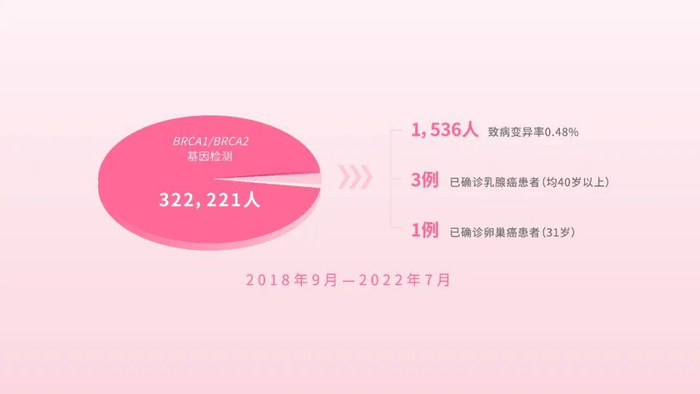 在2018年9月-2022年7月的近4年中,共计有322,221位爱康用户进行了BRCA1/BRCA2基因检测,其中有1,536位用户的BRCA1/BRCA2基因存在致病变异,致病变异率为0.48%。