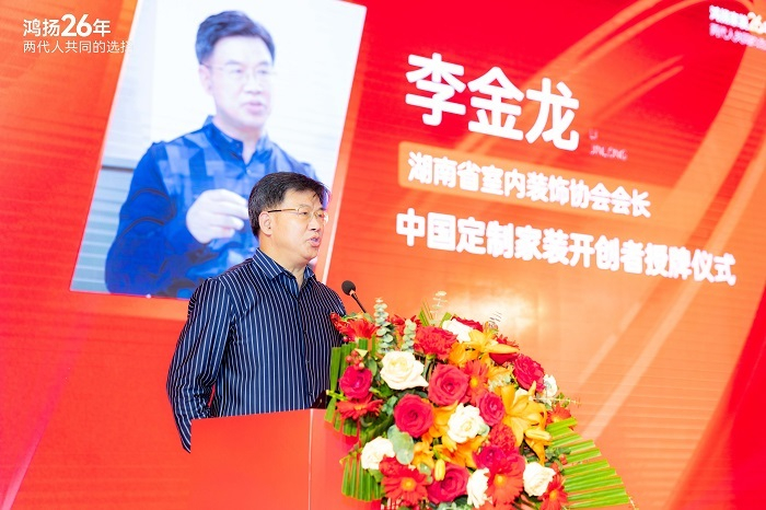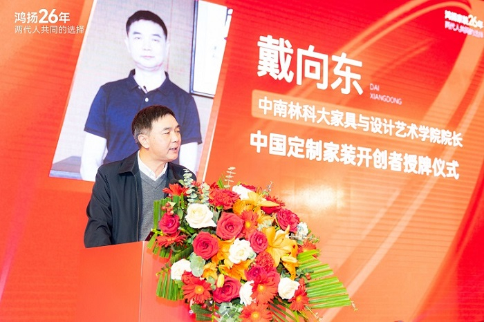 仪式现场,中南林业科技大学家具与设计艺术学院院长戴向东讲道,鸿扬家装专研定制家装20余年,期间不断吸纳“科班”优秀设计研发人才,他表示:“产学研合作将进一步加深,用科技、人才、美学赋能鸿扬定制家装。”