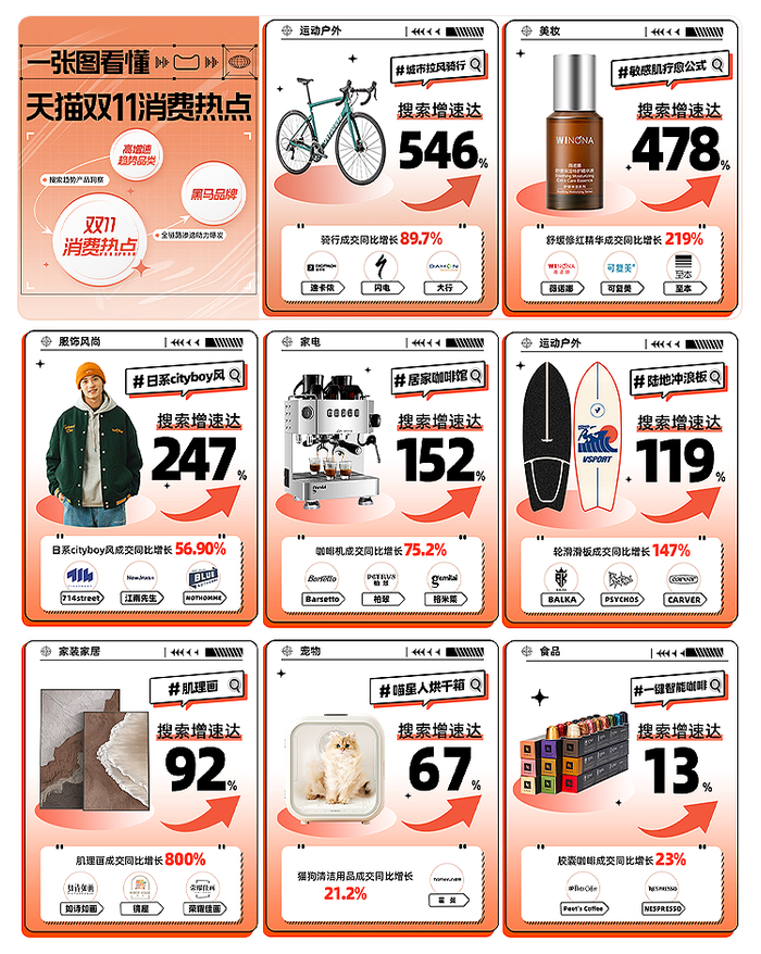 今年双11运动户外7大圈层买爆整个行业,10月31日晚8点天猫双11正式开卖首小时,滑雪增长61.9%,轮滑滑板增长147%,同时也有不少新兴运动场景冲出来,譬如陆冲、城市骑行、黑化露营等;而更精致的家电、食品等领域的需求也在爆发,譬如一平米水吧、一键智能咖啡等。美妆热点更偏向精细化的成分公式搭配,比如敏感肌疗愈公式、精准抗老公式等。在消费热点对应的黑马品牌中,不仅能看到薇诺娜等知名品牌,也能看到此前更偏小众的私藏,譬如至本等。