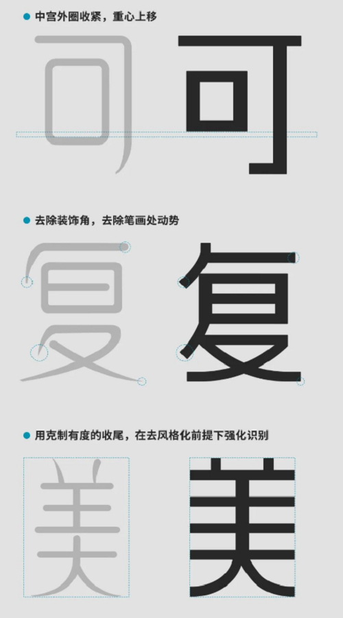 Logo对于品牌的重要性不言而喻,为了让品牌形象看上去更加严谨、理性,可复美的新标识规范了字体,以黑体文字为基础进行调整,“可”字中宫外圈收紧,中心上移;“复”去除装饰角,去除笔画处动势;“美”字用克制有度的收尾,在风格化前提下强化识别,黑体字体没有衬线装饰,字形端正,笔画横平竖直,表达了可复美端正严谨、脚踏实地的科研态度,这次升级让可复美logo视觉呈现更加协调与规整,也象征可复美到了一个更加成熟稳健的阶段,未来将以全新面貌迎接崭新发展。