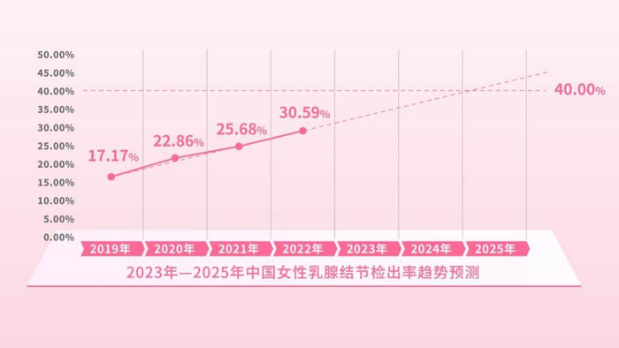 中国女性的乳腺健康状况长期来看,不容乐观。报告预测,到2025年,乳腺结节检出率预计将超过40%。年轻化,则是乳腺疾病的另一个重要趋势。根据历年粉红报告数据,2020年相比2018年,18-30岁女性用户的乳腺彩超(除乳腺增生外)异常检出率由17.51%升至22.97%。迅速攀升的比例给我们敲响了警钟,拯救乳腺健康刻不容缓。