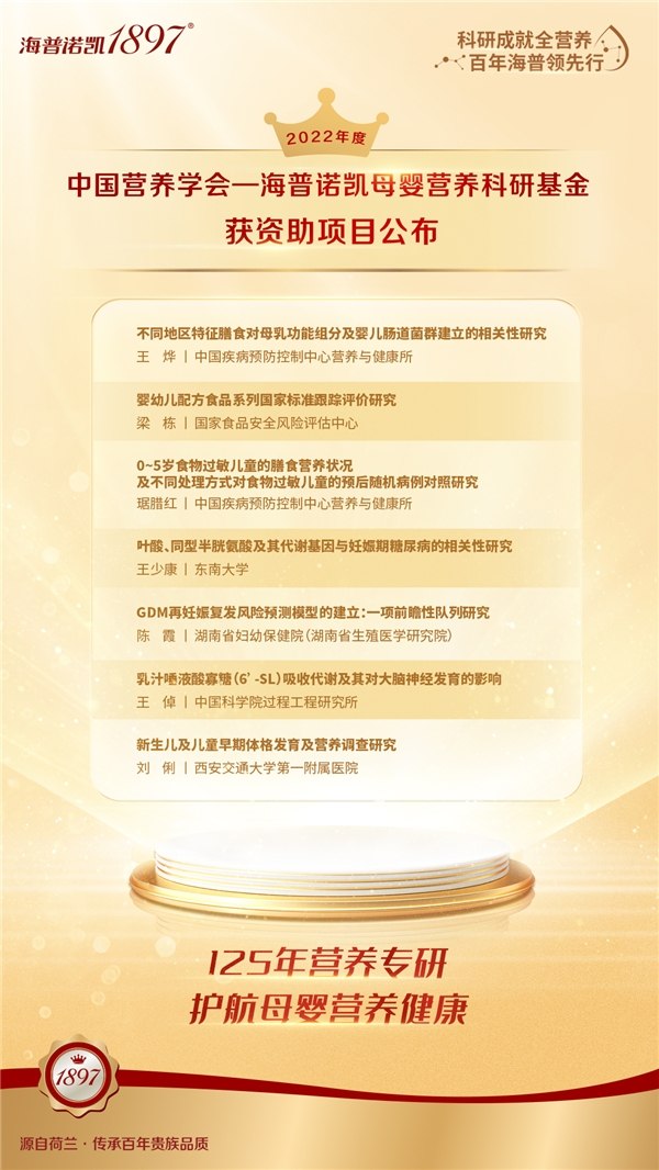 作为国际化的荷兰高端奶粉品牌,海普诺凯1897一直将促进母婴营养健康发展,推动其科研水平作为工作重点,今年第二届“中国营养学会-海普诺凯母婴营养科研基金”,公布的资助课题研究方向更加细化,研究重点关注“母乳特征功能组分及营养特性研究”以及“母婴人群的营养干预研究”两大方向,聚焦于母乳中的活性成分研究及过敏、腹泻婴幼儿及早产儿的营养需求,引领生命早期的营养健康研究持续向新,既是为婴幼儿喂养和母婴健康改善提供最新的理论支持,也展示了海普诺凯1897在母乳研究“深水区”的持续探索和突破。