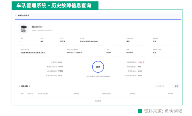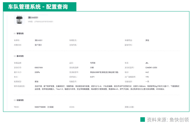 如何实现车队“精细化管理”?以鱼快创领为车队提供的管理系统为例:车队管理者在首页输入车牌号或者车架号后,即可在该页面看到对应车辆的基本配置,包括:驾驶室、发动机、 变速箱、后桥、悬架、鞍座、后处理系统等。以上信息可帮助车队管理者快速查并了解一台车的相关配置。