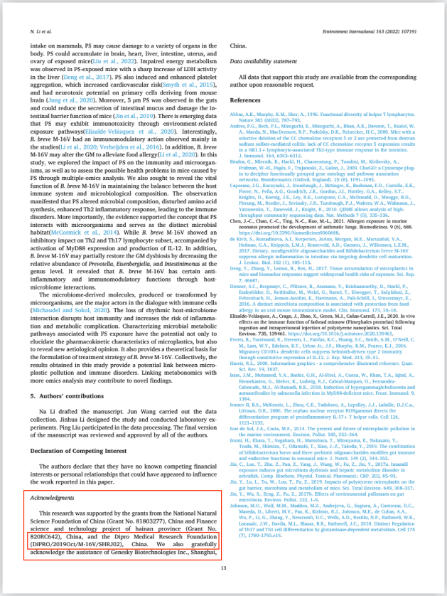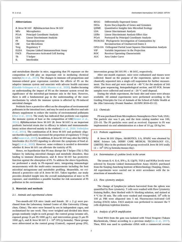 [1] Li N, Wang J, Liu P, Li J, Xu C. Multi-omics reveals that Bifidobacterium breve M-16V may alleviate the immune dysregulation caused by nanopolystyrene. Environ Int. 2022 May;163:107191. doi: 10.1016/j.envint.2022.107191.