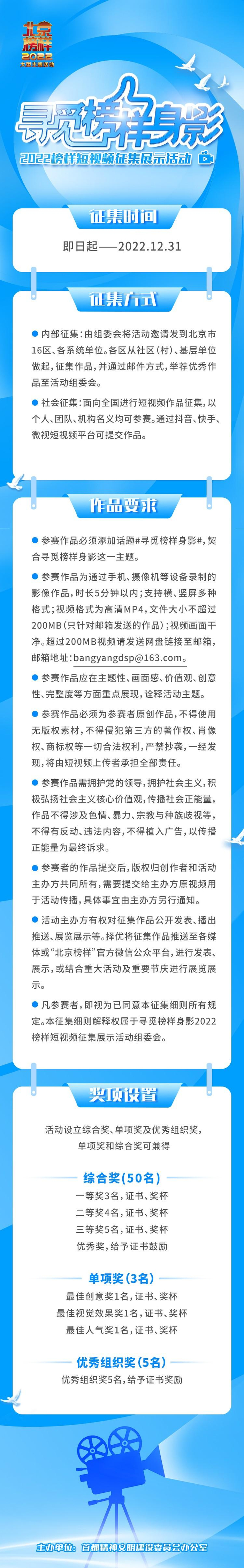 为深入贯彻学习落实党的精神,由首都精神文明建设委员会办公室主办的“寻觅榜样身影”——2022榜样短视频征集展示活动于近期启动。本次活动通过短视频征集、评审表彰的形式,发动全市宣传展示在弘扬建党精神、奉献冬奥、积极抗疫、文明城区治理、“四个中心”建设、践行精神文明等重点工作中的榜样身影。