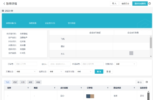 企业月底统一报账,财务会收到合思商城发来的本月对账单。合思商城对账单已按照飞机、酒店、火车、用车、用餐的维度拆分好,统计各类目下的消费金额&消费条数。在每一条消费明细下,可看到订单、开票状态、申请单信息、预订人、所属部门、总费用、手续费等。信息清楚,一目了然。通过系统发起对账单审批,负责人审批通过后,本月对账已结束。