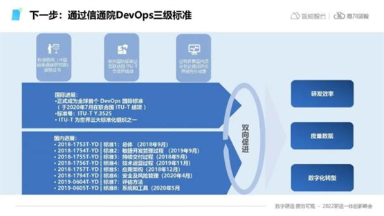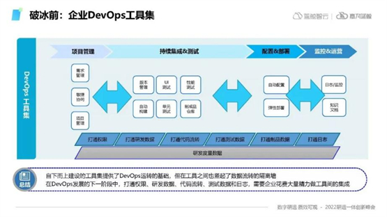 所以DevOps工具建设的下一个阶段,需要企业花费大量精力做工具间的集成,通过整合工具、打通权限、打通测试数据和日志等数据流,使代码能够在工具之间流转。