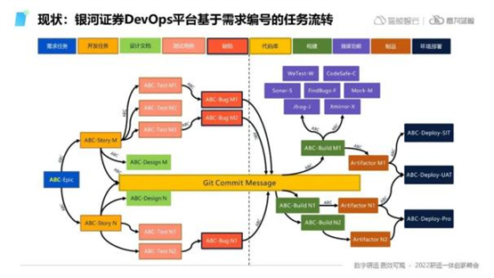 以下是DevOps数据打通的示意图,自前期设计的时候开始,中国银河证券就已经做好了打通所有研发数据的准备。中国银河证券基于JIRA的需求编号,通过让开发人员在代码提交时,要求在Git Commit Message中关联到JIRA需求编号的形式,将需求任务、开发任务、缺陷代码、流水线集成、部署制品,数据打通并关联到一起,为后续度量平台的建设提供了数据上的支持。