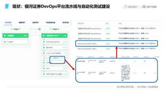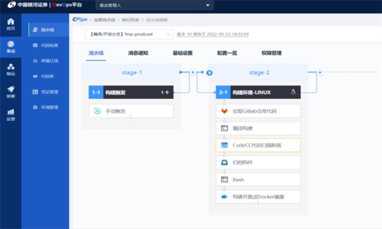 以下是DevOps完整流水线的配置示意图,可以看到中国银河证券是重流水线设计型,而有一些企业是轻流水线设计型,这个没有好坏之分。在中国银河证券流水线的应用里面,会设置有大量的门禁和审批节点,帮助中国银河证券实现研发管理的自动化和强管控。