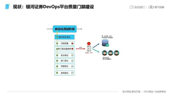 以下是DevOps流水线的质量门禁。通过整合测试相关的数据,在流水线中加入可以定制化的质量门禁。开发的日常工作中会有很多定制化的数据进来,当不符合门禁要求的代码流经流水线的时候,门禁就会自动化拦截并通知相关开发人员,实现代码质量的自动化管控。