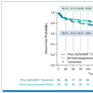 在整个研究期间,接受伊奈利珠单抗治疗的患者中,有94例既往接受过硫唑嘌呤/吗替麦考酚(AZA/MMF)治疗,103例未接受过免疫抑制剂治疗。既往接受过AZA/MMF治疗的患者年化复发率为11%,年化NMOSD相关住院率为15%,而无免疫抑制剂治疗史的患者则分别为8%和12%。无论既往是否接受过免疫抑制剂治疗,伊奈利珠单抗长期治疗期间所有患者均维持较低的发作几率(图 1)。