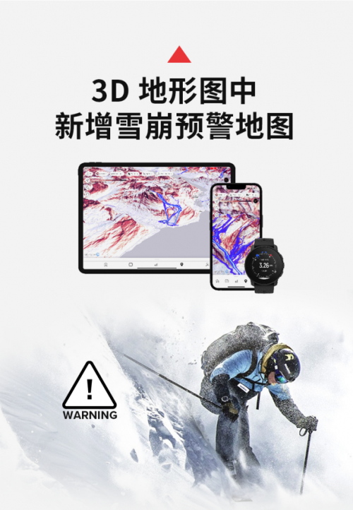Suunto应用程序的一项新特性是可与 iPad 和 Android 平板电脑兼容,用户可以预先构建训练计划,并在训练过程中遵循预定计划。新的雪崩地形图会提示有雪崩危险的区域,更便于用户制定安全的高山旅行计划。结束探险行程后,用户可以通过 3D 动画与朋友和家人分享此次探险之旅。