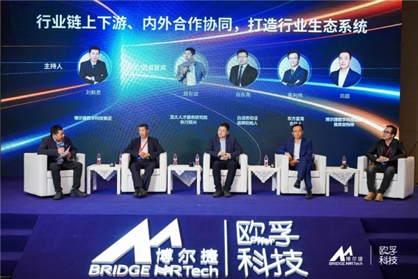 “行业链上下游、内外合作协同、打造行业生态系统”,本次大会特别设置了圆桌讨论环节,特邀博尔捷数字科技集团刘鹤君作为主持嘉宾,与现场4位嘉宾大咖:东方富海合伙人陈利伟、亚太人才服务研究院执行院长聂有诚、白话劳动法品牌创始人白永亮、博尔捷数字科技集团研发中心邓超,从多个视角以及人力资源机构数字化工具解决方案给予充分探讨。