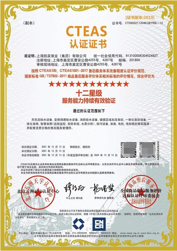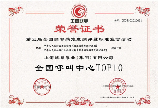 2021年,在第十届“全国售后服务评价大会”上,凯泉同时斩获“全国售后服务TOP10”,“全国国标五星级售后服务企业”,“全国呼叫中心TOP10”三项荣誉,同年年底,更是获得“全国售后服务持续能力有效验证”最高级别“十二星级”的荣誉;此前,集团曾多年蝉联全国售后服务十佳单位、全国十佳呼叫中心、全国售后服务先进单位等称号,这些荣誉是对凯泉服务品质最权威的认证。