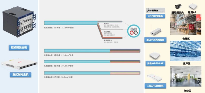 时光主机所带来的另一个巨大变化则在场景适配和成本上,由于使用了光电混合缆,信息点位的频繁变化和增扩展无需更改线路,入室交换机也无需本地部署强电,从源头上避免弱电间线缆凌乱、桥架空间不足、运维困难等问题: