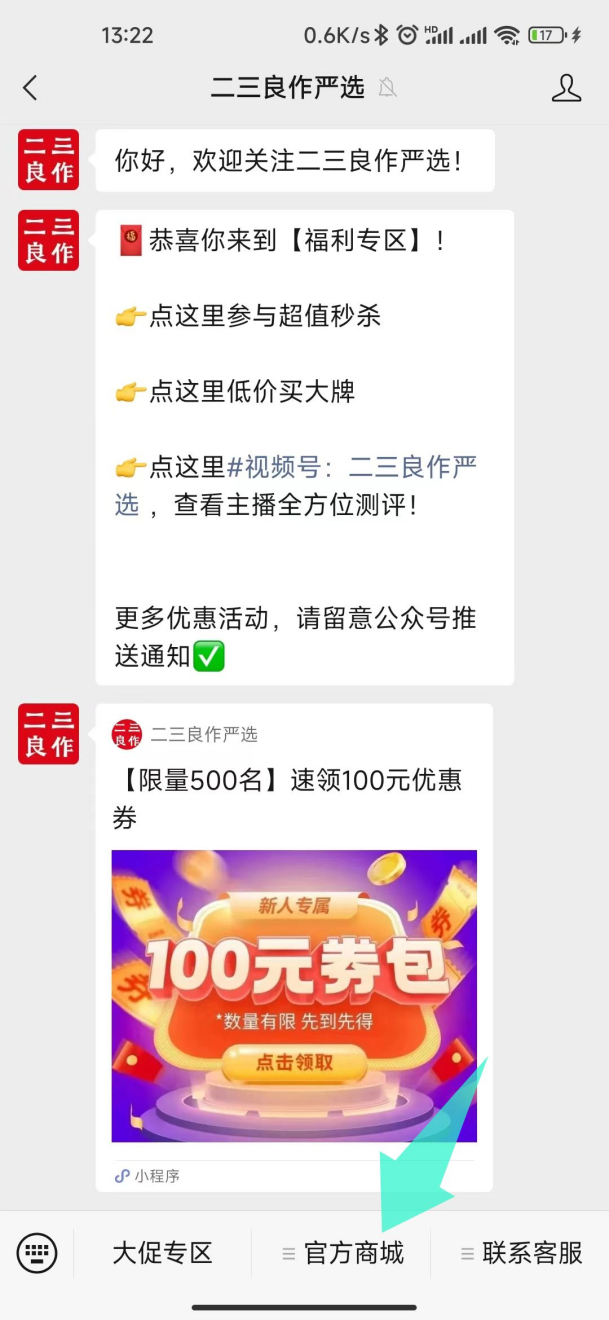 接下来我们再来介绍一下另外一种方法,您可以在微信的公众号上直接输入【二三良作严选】并点击搜索,然后点击关注我们二三良作严选的官方公众号,在这里您可以实时接收到官方平台推送的各类优惠活动通知。商城的入口,就在公众号底部菜单栏中间的“官方商城”中,您可以直接点击菜单中的“商城首页”,跳转进入我们的官方商城主页。怎么样,是不是还挺简单的,快快拿出你们的手机,按照上面介绍的步骤操作试一下吧~