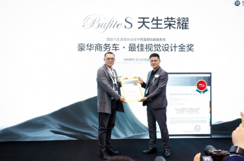 新品发布会上,国际汽车改装协会授予巴菲特 S 级商务车豪华商务车·最佳视觉设计金奖。