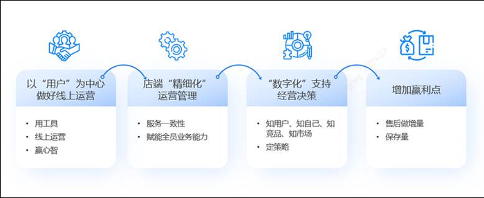 强化经营是通过销售终端多点覆盖、售后横向延伸,帮助经销商发掘市场增量和机会点。通过司南升级2.0版本,深度赋能商家经营价值链,帮助经销商提升数字化经营决策能力,让商家“知的多,觉的清,行的易”,助力增收提利;新增的售后环节产品及专线,将通过发布保养服务、促销活动、优惠券等信息,建立用户同店端的便捷化联系,帮助经销商获得售后商机,拓客保客。