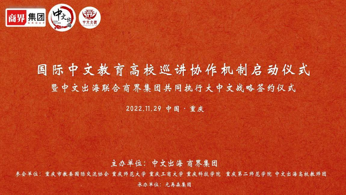 11月29日,国际中文教育高校巡讲协作机制启动仪式,暨中文出海联合商界创新集团共同执行大中文战略签约发布仪式在重庆成功举办。