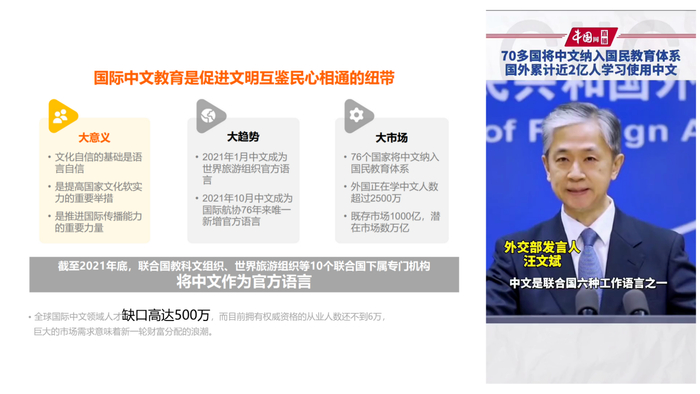 据官方资料显示,截至2021年底,联合国教科文组织、世界旅游组织等10个联合国下属专门机构将中文作为官方语言,76个国家将中文纳入国民教育体系,外国正在学中文的人数超过2500万,累计近2亿人学习中文。中文教育既存市场1000亿,潜在市场数万亿。