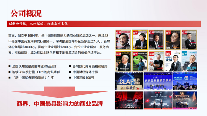 作为此次活动的联合发起方商界集团,创立于1994年,是中国最具影响力的商业财经品牌之一,连续28年稳居中国商业期刊发行量第一,采访报道国内外企业家超过10万,新媒体粉丝超过3000万,影响企业家超过1300万。定位企业家群体,服务商界,推动创新,成为推动全球创新和本地资源结合的价值创造平台。