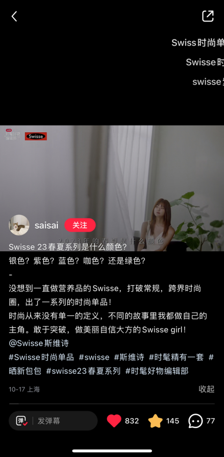 时尚质感的短片展现了Swisse斯维诗「自然健康新时尚」的品牌调性。不少用户在观看后拓展了对Swisse斯维诗品牌的认知,并纷纷在评论区下评论“Swisse时尚单品超喜欢”、“莫名喜欢浅灰(or银色)撞蓝,浅驼撞绿”,对活动主推系列周边种草。