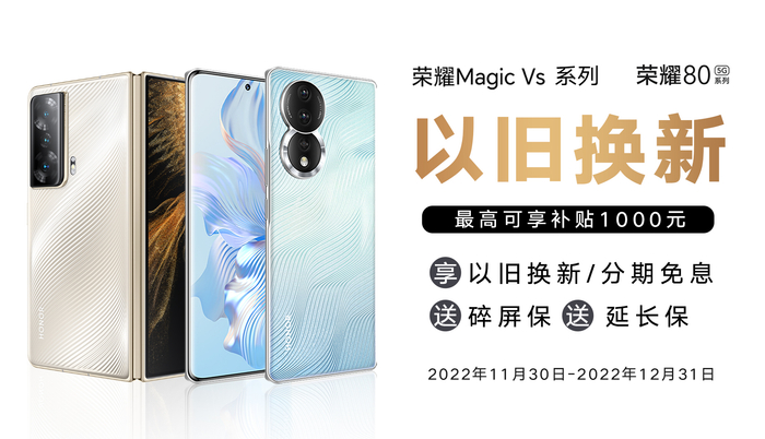 2022年11月30日,荣耀全新折叠屏旗舰手机Magic Vs系列正式开售。与此同时,荣耀联合国内头部手机回收品牌“闪回收”推出了为期一个月的以旧换新活动。11月30日-12月31日活动期间,只要旧机回收价满足相应区间,消费者选择换新荣耀80/80 Pro、荣耀Magic Vs,最高可享补贴1000元,还可获赠价值1898元的碎屏保险服务,这一优惠力度在很大程度上点燃了消费者的购机激情。